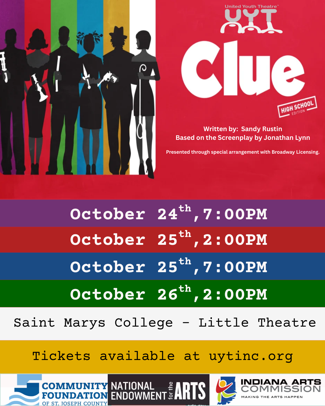 United Youth Theatre Presents CLUE: High School Edition — A Hilarious Whodunit Live on Stage, Oct. 24–26 South Bend, IN — Grab your trench coat and magnifying glass, United Youth Theatre (UYT) is bringing the fast-paced, laugh-out-loud mystery CLUE: High School Edition to the stage this fall, featuring 20+ performers in grades 7–12 from across Michiana. Based on the beloved board game and cult classic film, CLUE drops audiences into Boddy Manor on a dark and stormy night. Six colorful suspects, Scarlet, Plum, White, Green, Peacock, and Mustard scramble to solve a murder before the body count rises. With secret passages, suspicious butlers, and a steady stream of twists, this madcap comedy will keep you guessing (and laughing) right up to the final reveal. Performance Dates & Venue Thu, Oct 24 at 7:00 PM Fri, Oct 25 at 2:00 PM & 7:00 PM Sat, Oct 26 at 2:00 PM Location: Saint Mary’s College — Moreau Center for the Arts, Little Theatre Tickets $15 (12 and up) • $10 Purchase at uytinc.org (advance sales close 24 hours before each performance). Tickets are also available at the door. For questions, contact: Drake Shrader at drakeshrader@uytinc.org