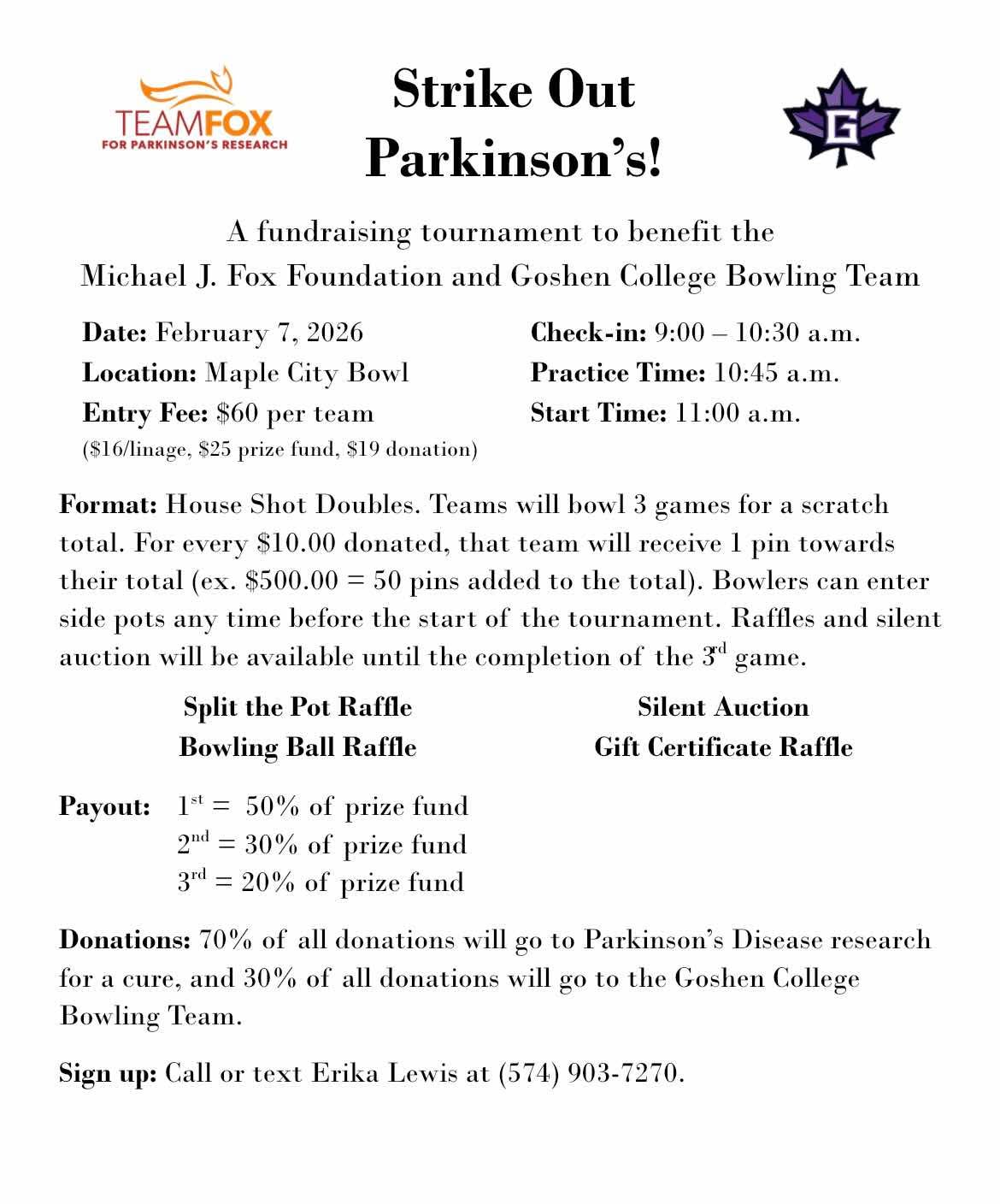 On February 7, 2026, the Goshen College Bowling Team and Steve Squires are hosting a bowling tournament called “Strike Out Parkinson’s”. This is a fundraiser tournament to raise money for the Michael J. Fox Foundation to support Parkinson’s disease research. The format is doubles, and everyone bowls three games. The entry fee is $60 per double ($30 per person). Check-in starts at 9:00 a.m., practice starts at 11:40 a.m., with the tournament starting at 11:00 a.m. There will be multiple raffles, side pots for bowlers to enter, and a silent auction. Bowlers of all skill level are welcome to participate, and everyone is welcome to be a spectator and participate in our raffles. We are also accepting gift donations for the raffles.
